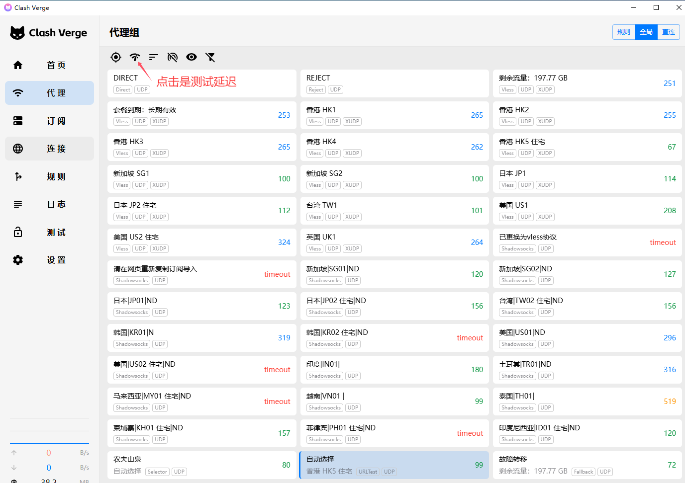 根据检测结果选择,红色Etimeout的节点表示暂时无法使用,绿色的数字代表可用的节点,理论上延迟越低越好用,但需要根据实际情况和使用需求决定,延迟和速度无关。